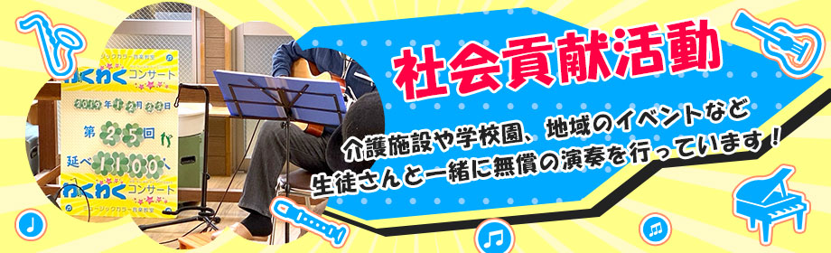 株式会社ミュージックカラー音楽教室は、音楽で社会を豊かにするため、CSR(社会貢献活動)を積極的に実施しています。主な内容は、介護施設や学校園、地域のイベントなどでニーズに合わせた演奏活動を行っています。