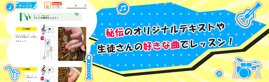 ミュージックカラー音楽教室中妻校では、秘伝のオリジナルテキストを使用したり、生徒さんの好きな曲でレッスンをしています!