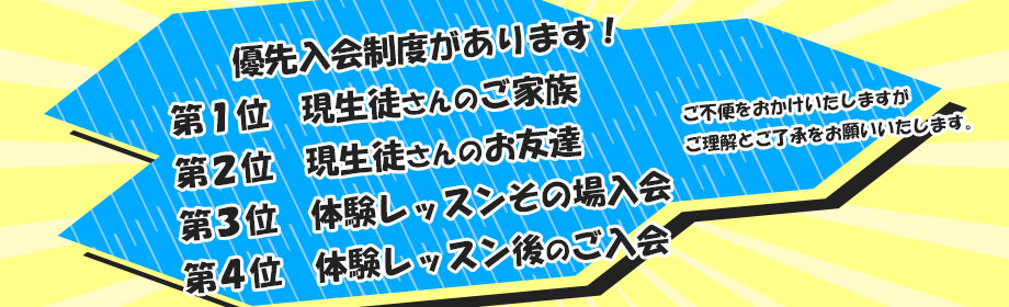体験レッスンその場でのご入会の方が優先されますので、後日ご入会を希望されましても空き枠がなくお待ちいただく場合がございます。ご質問や疑問点は体験レッスンまでに解消していただけるようしっかりご説明させていただきますので、些細なことでもお気軽にご相談くださいませ!