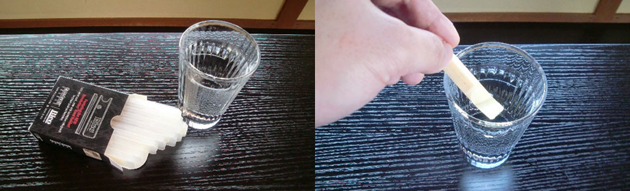 ところでみなさんは、新しいリードを買ってきた時、箱から出してすぐに練習や本番で使ったりしていませんか?私のまわりにはそんな方が結構います。しかしそれは絶対にダメです!リードはじっくり時間をかけて育てると、1箱10枚中7枚いや9枚は使えるようになります。さらに、リードの寿命もグンと長くなります。私の場合、本格的に使いだすまでに1カ月くらいの時間をかけます。詳しく紹介します。