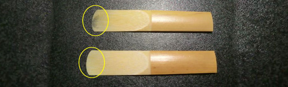 そろそろ、じゃんじゃん使いたいなと思うかもしれませんが、まだまだ我慢します。2週目と3週目ではリード1枚1枚に応じた育て方をします。1週目では、1枚あたりおおむね10分程度と、吹く時間を決めていました。これからはリードががんばれるだけ吹きこんであげます。リードの限界、その見極めは次の画像をご覧ください。